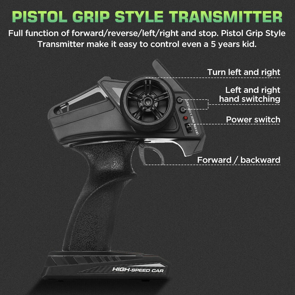 High-speed RC racing car built for off-road and on-road terrain. Reaches speeds up to 30KM/H with a powerful 260 motor and crash-proof PVC shell. Features full-function steering for forward, backward, turning, drifting, and flipping. Equipped with 2.4GHz radio system for control up to 120 meters and supports racing up to 10 cars simultaneously. Spring-loaded 4-wheel suspension with high-grip off-road tires ensures durability and stability on rugged surfaces.